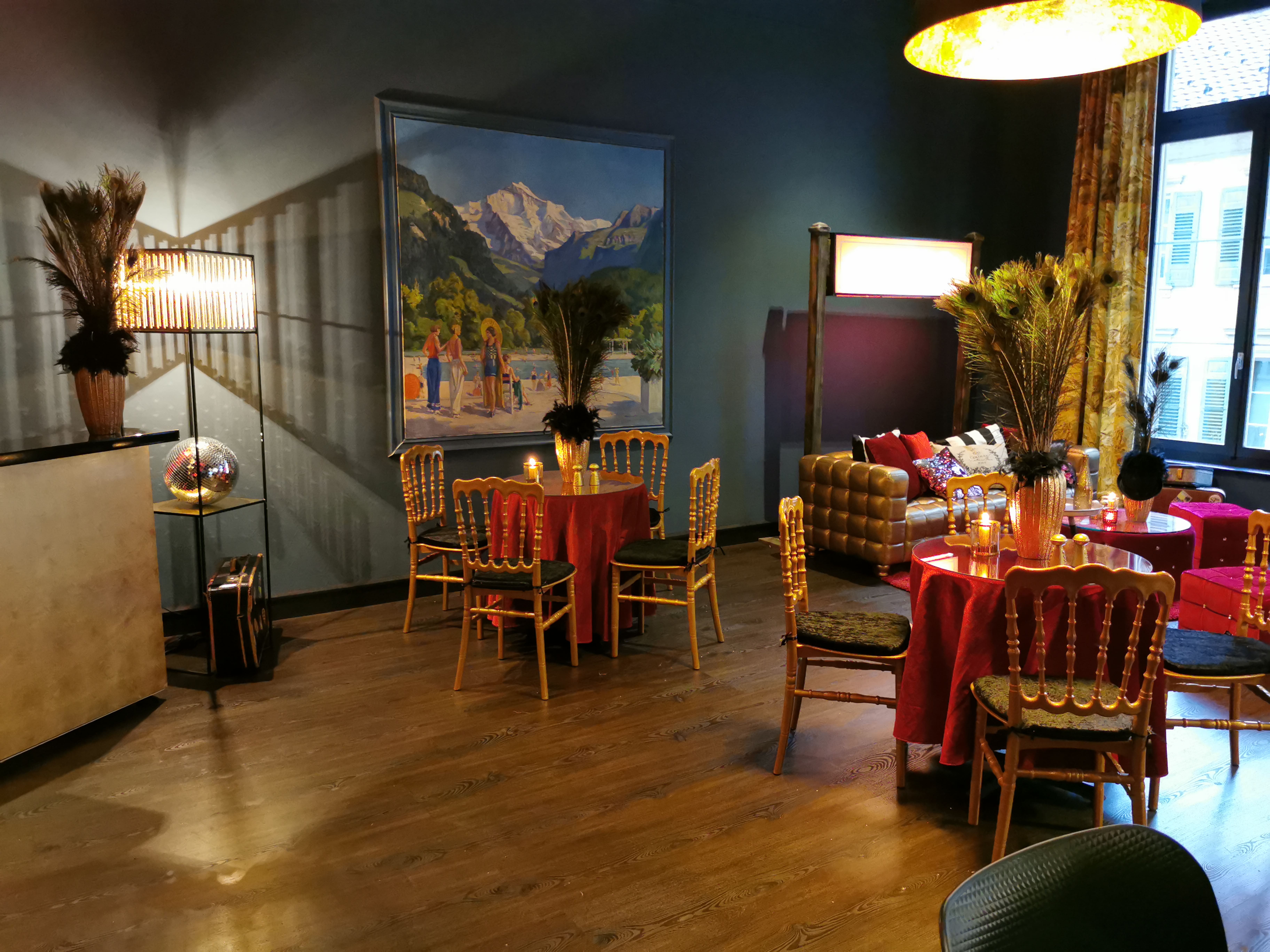 Tauchen Sie ein in die glanzvolle Welt unseres Gatsby Gala-Dinners und Lounges. Inspiriert von den 1920er-Jahren verbinden wir elegantes Mietmobiliar, glamourös Dekorationen und stimmungsvolle Lichtkonzepte zu einem harmonischen Raumdesign. Unser Team von eventdekorationen.ch setzt jedes Detail individuell um und schafft eine prunkvolle Atmosphäre, die Ihre Gäste begeistert. Jetzt kontaktieren und Ihr massgeschneidertes Eventkonzept sichern.